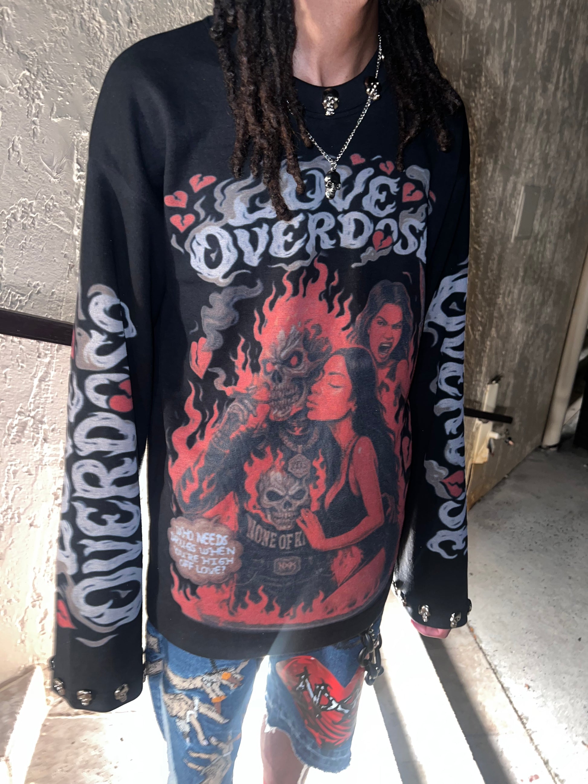 - LOVE OVERDOSE” Smokey print on the front and sleeves