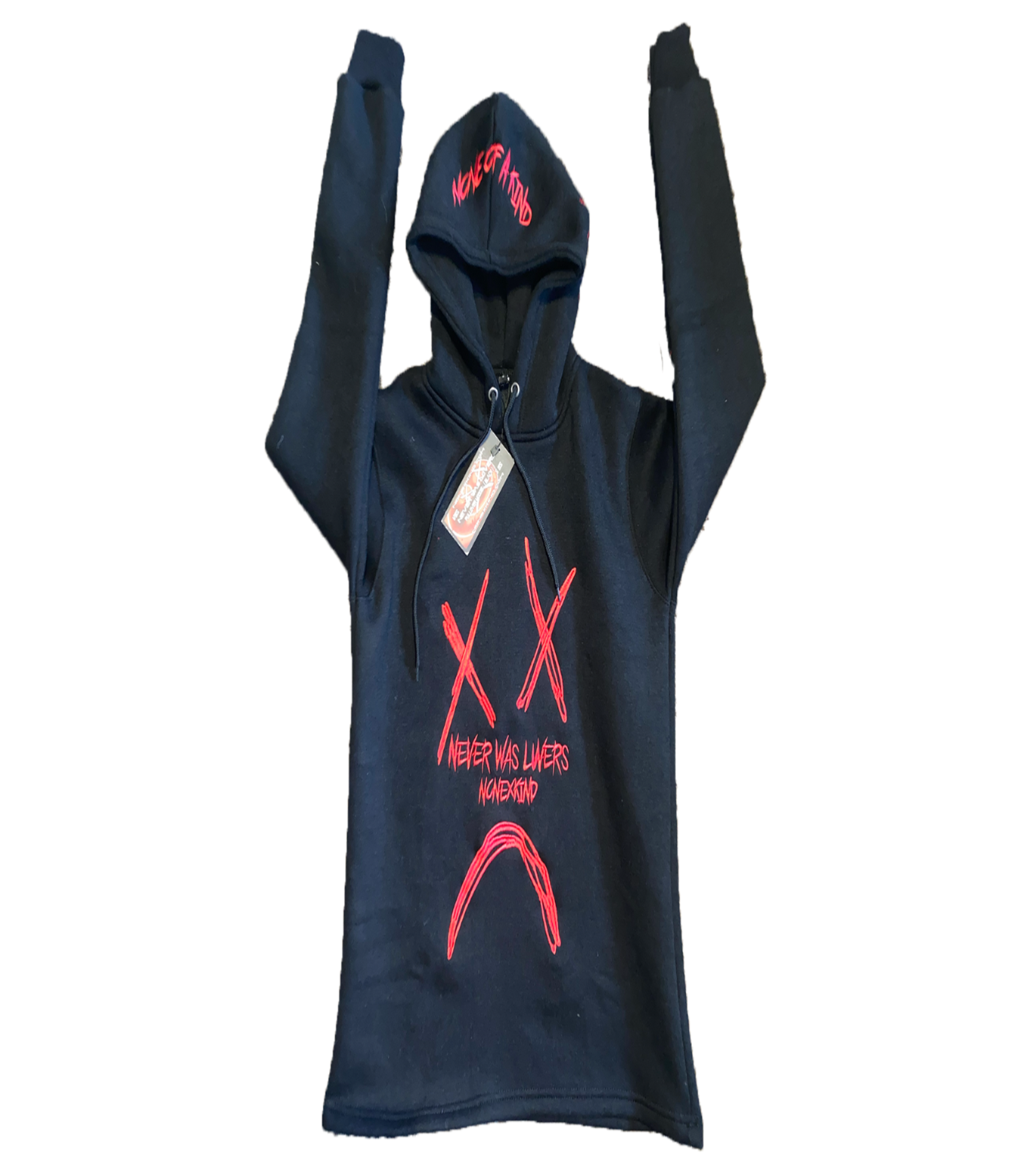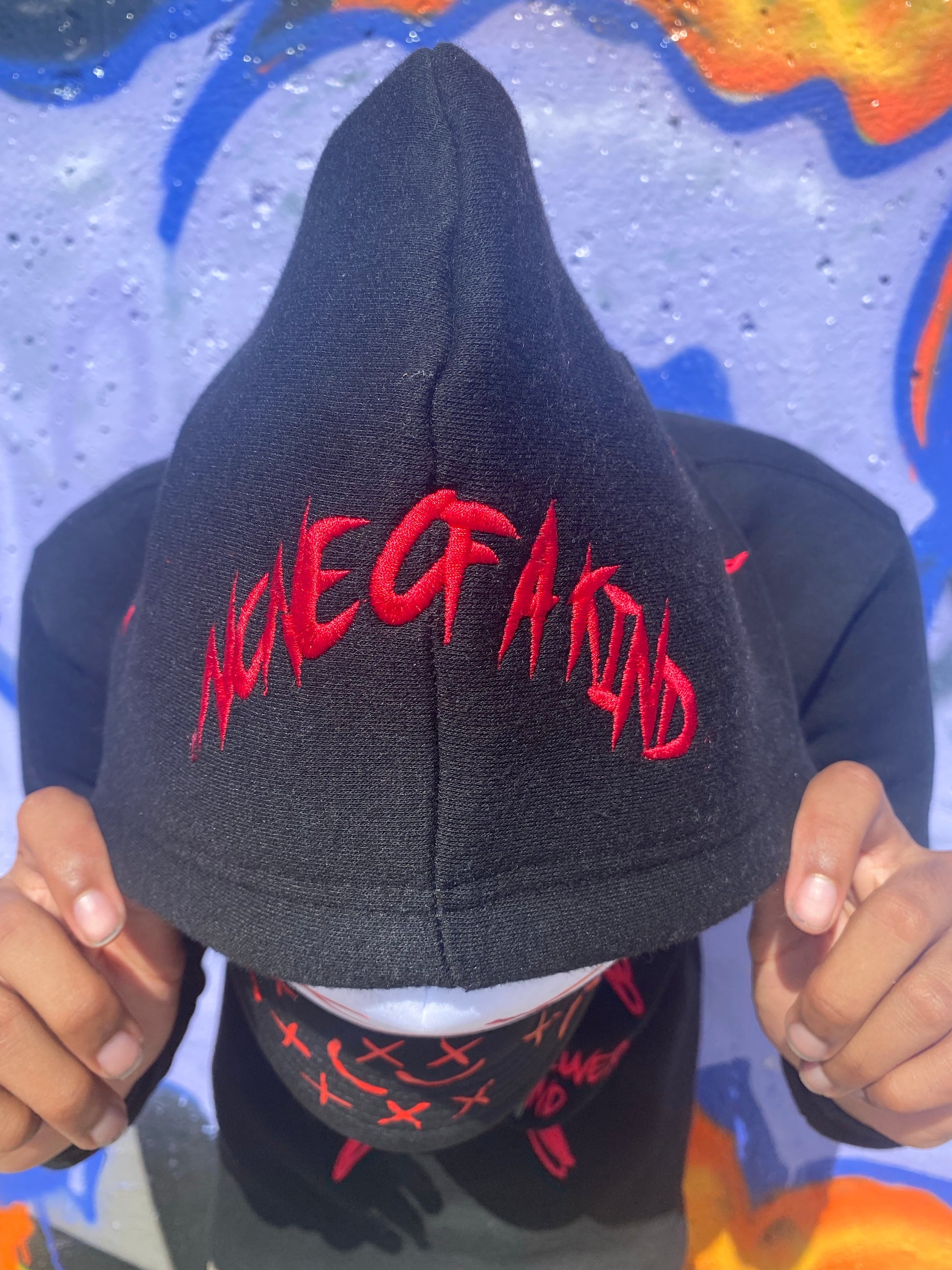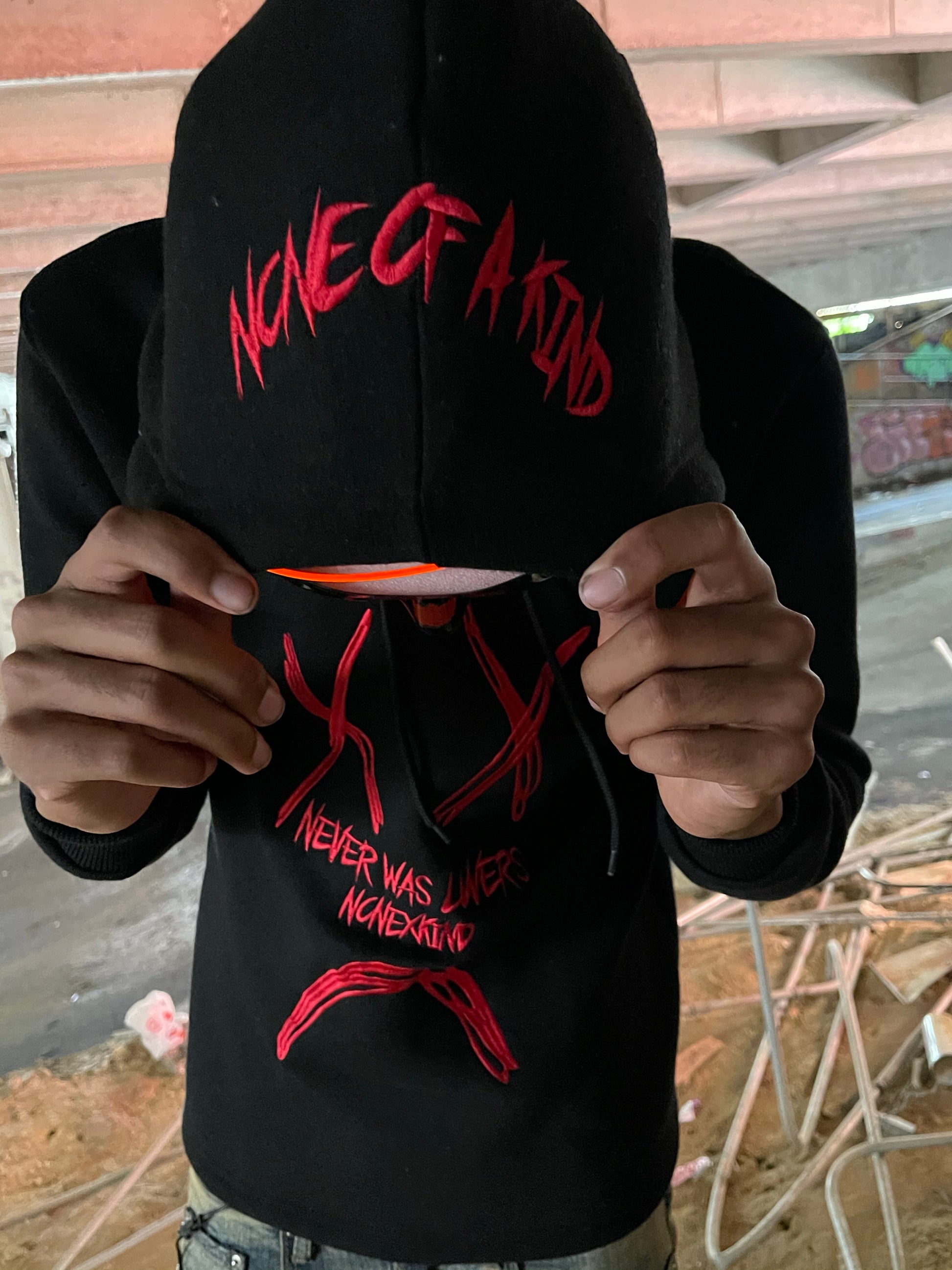 Stitched [RED] “NONE OF A KIND” appliqué across the top side of the hood