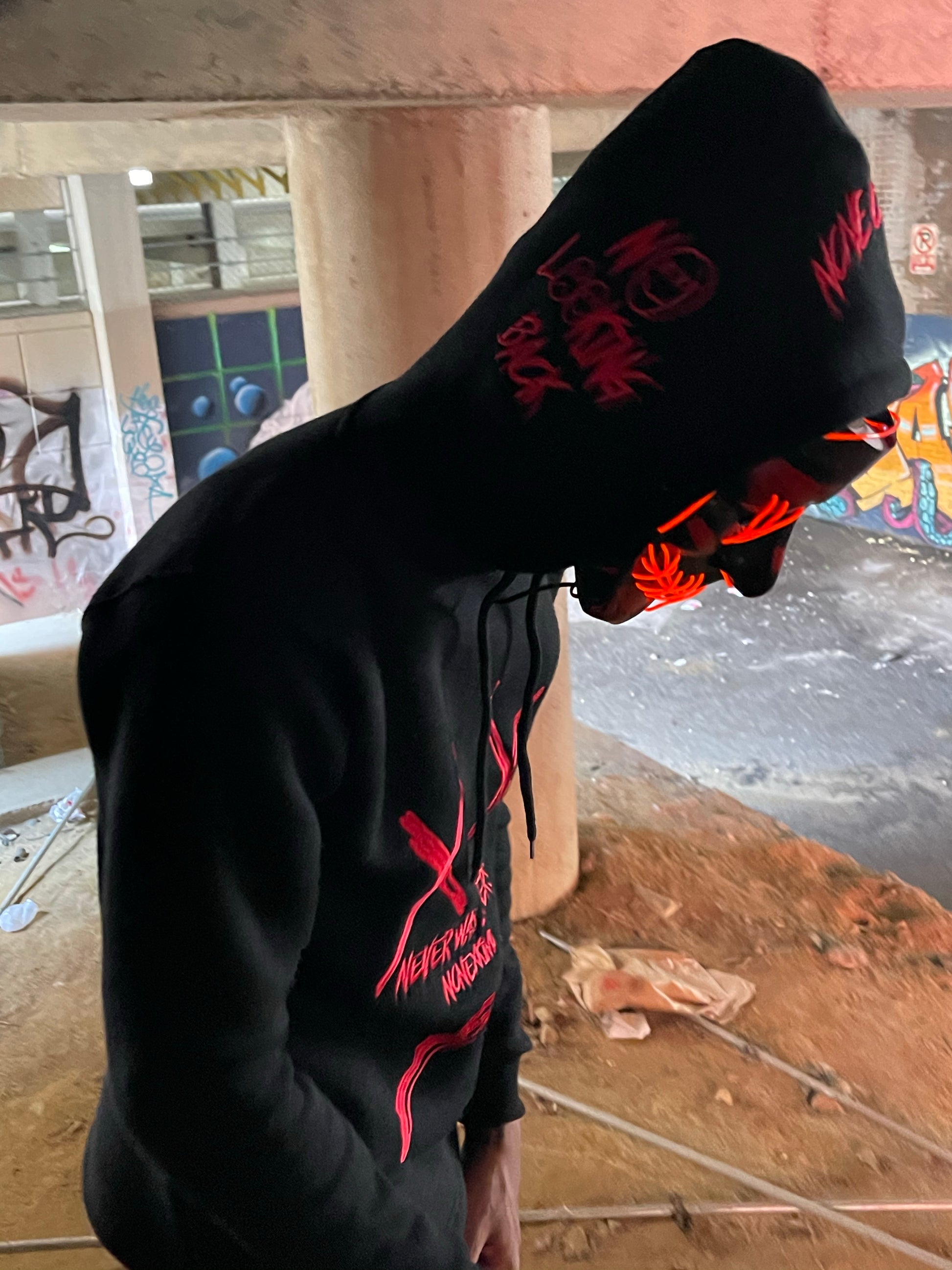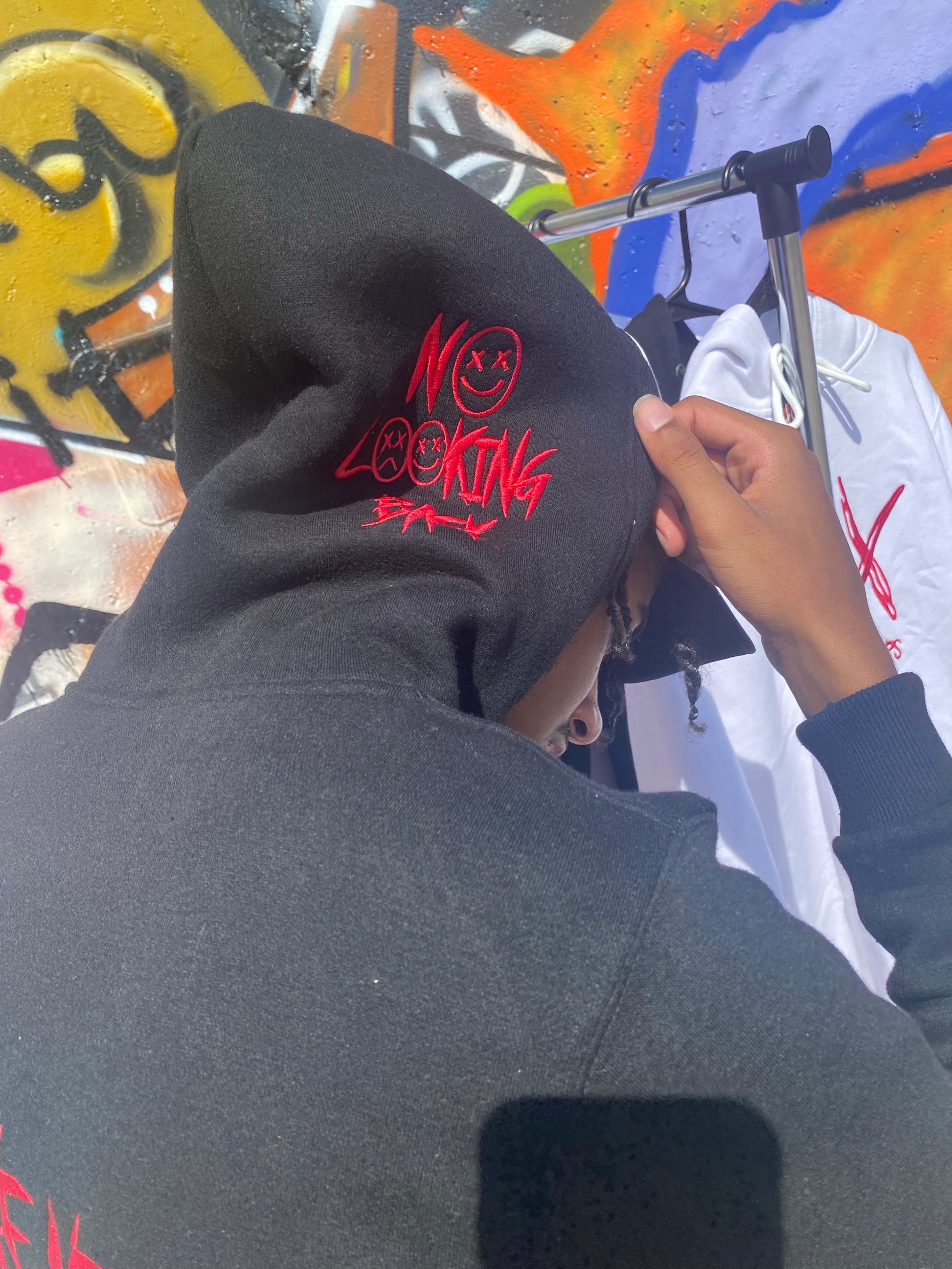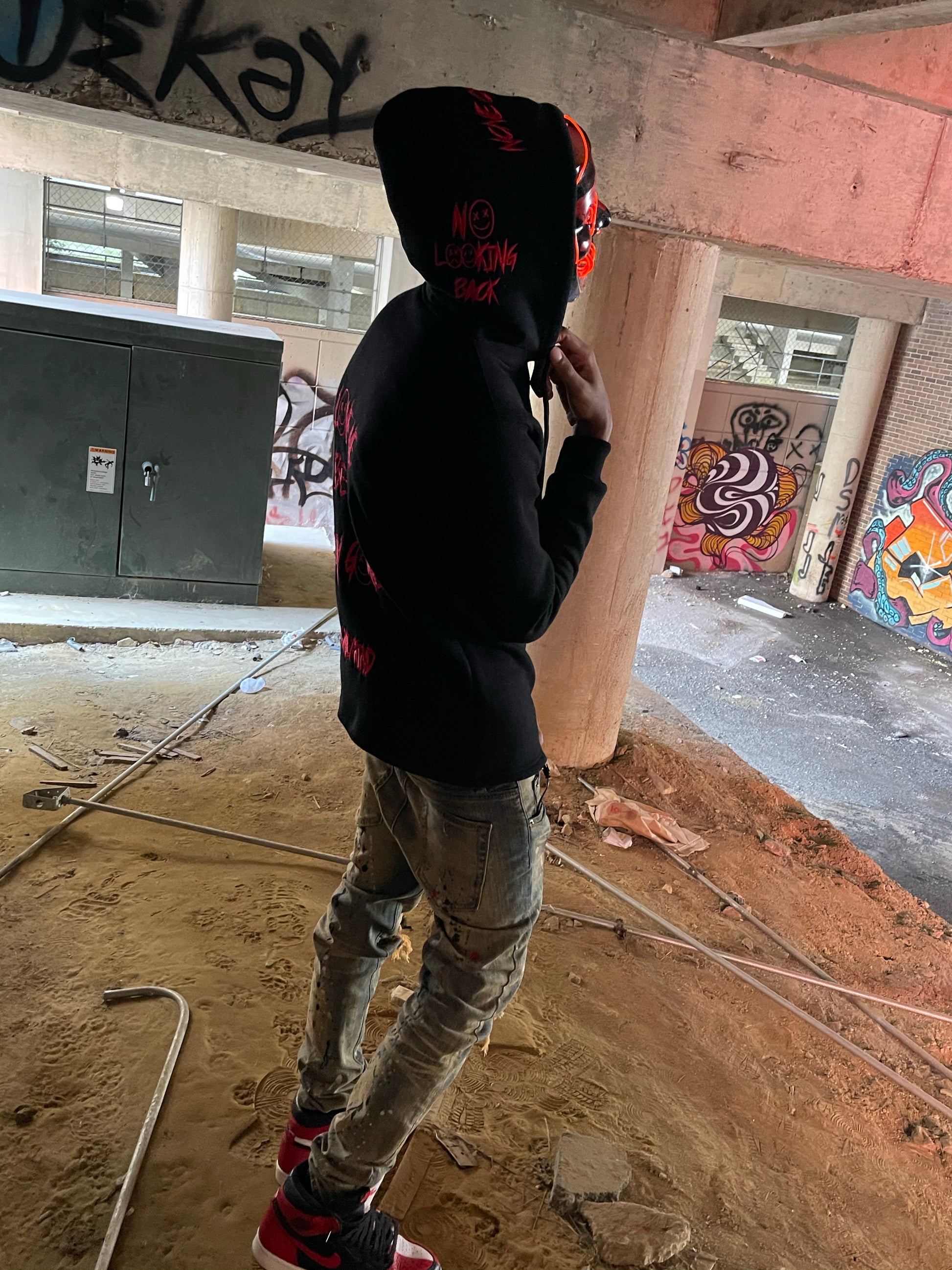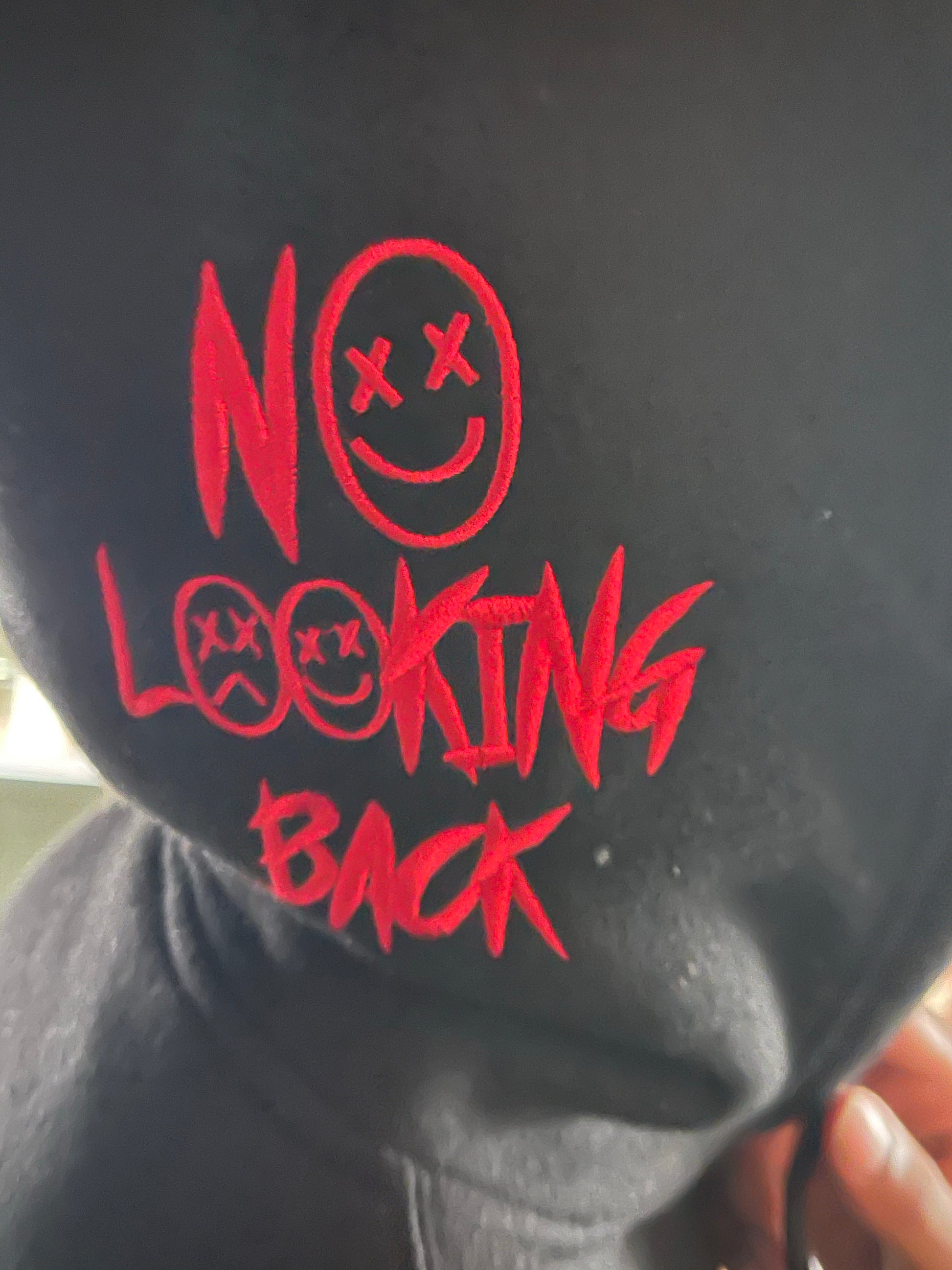 Stitched [RED] “NO LOOKING BACK” in sad & smiley faces on the right side of the hood