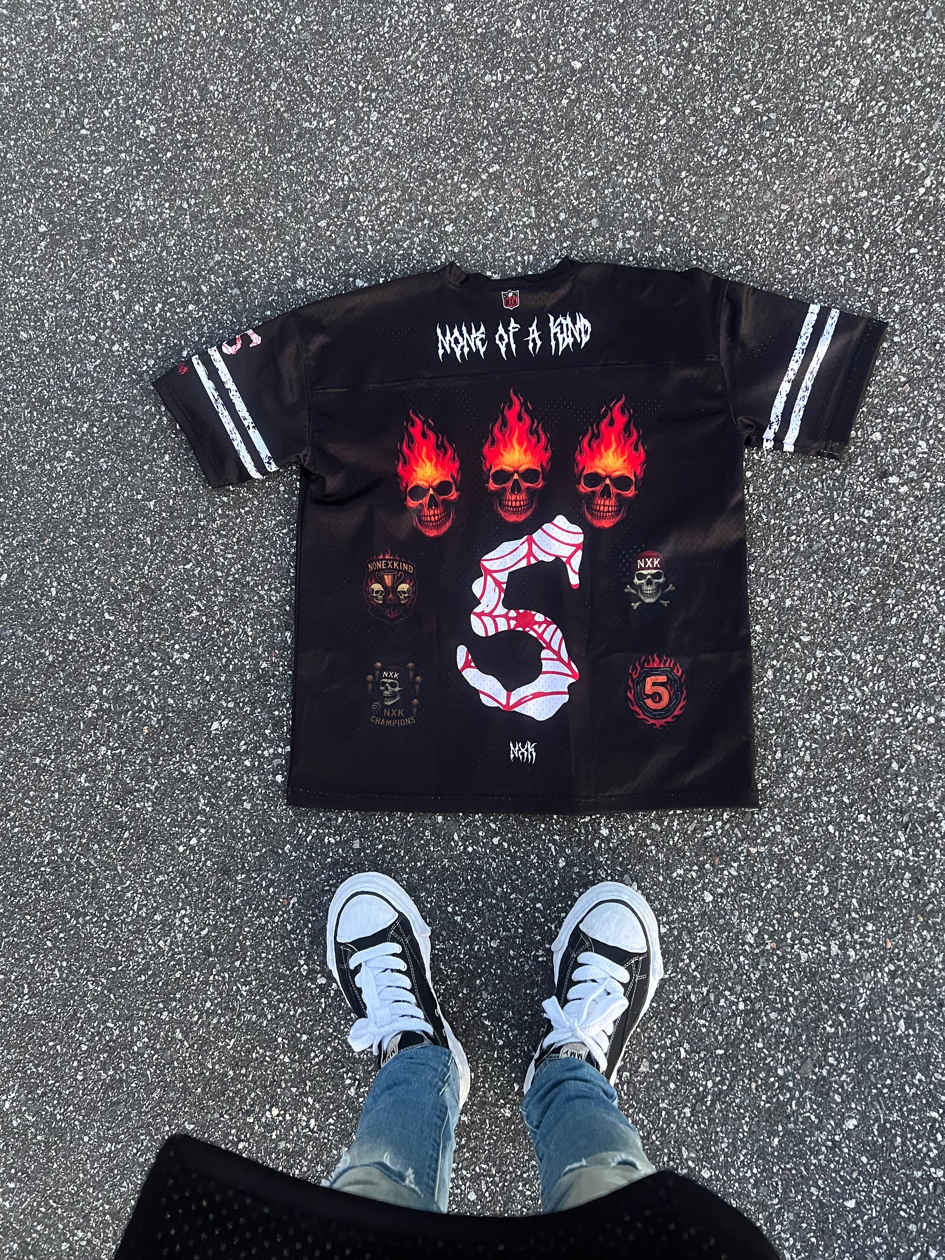 • Premium black mesh football jersey with a bold flaming skeleton and money graphic