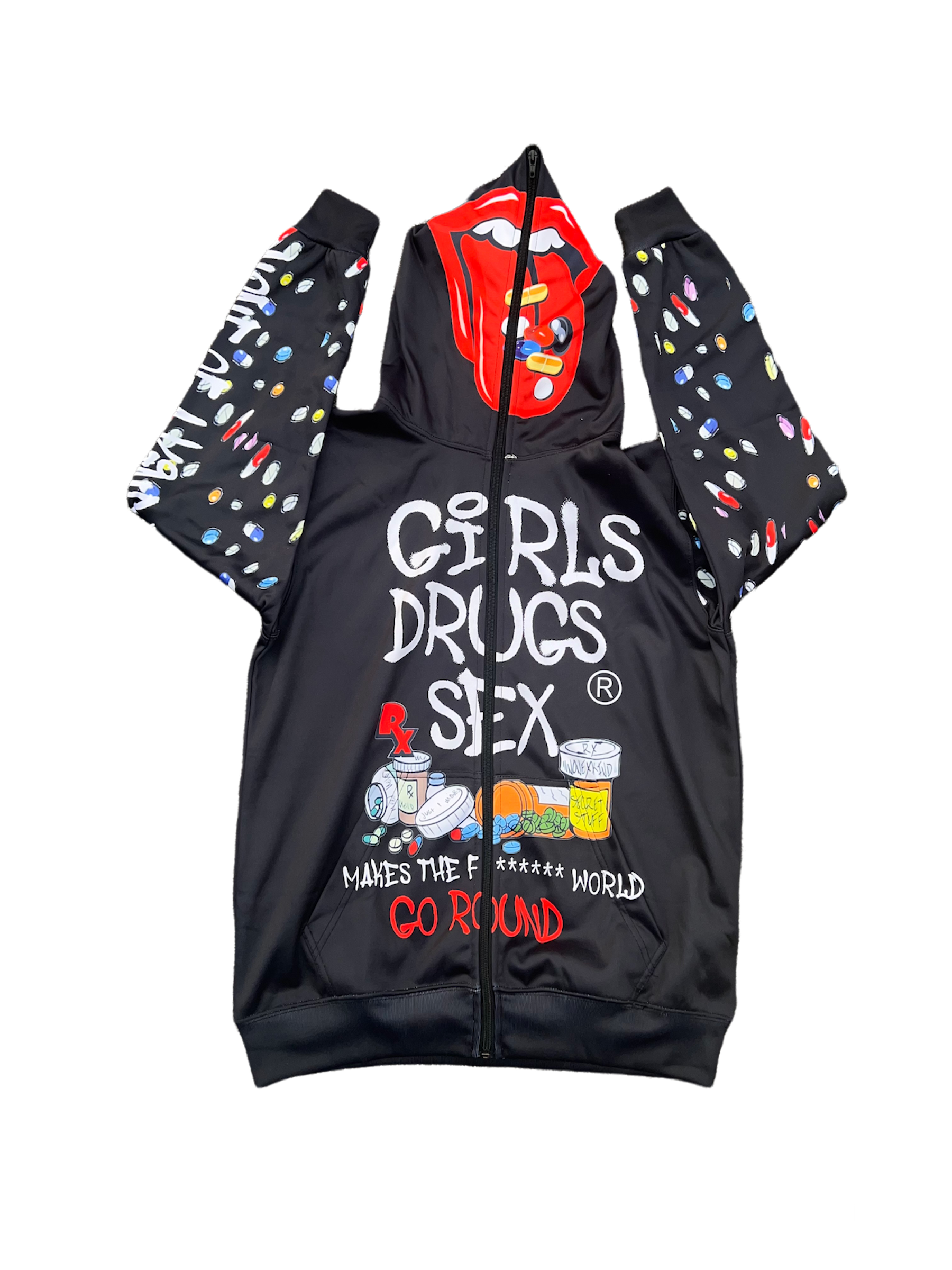 Sublimated [WHITE] “GIRLS DRUGS SEX” saying going down the front with a selection of different pill bottles dumped over on both pockets