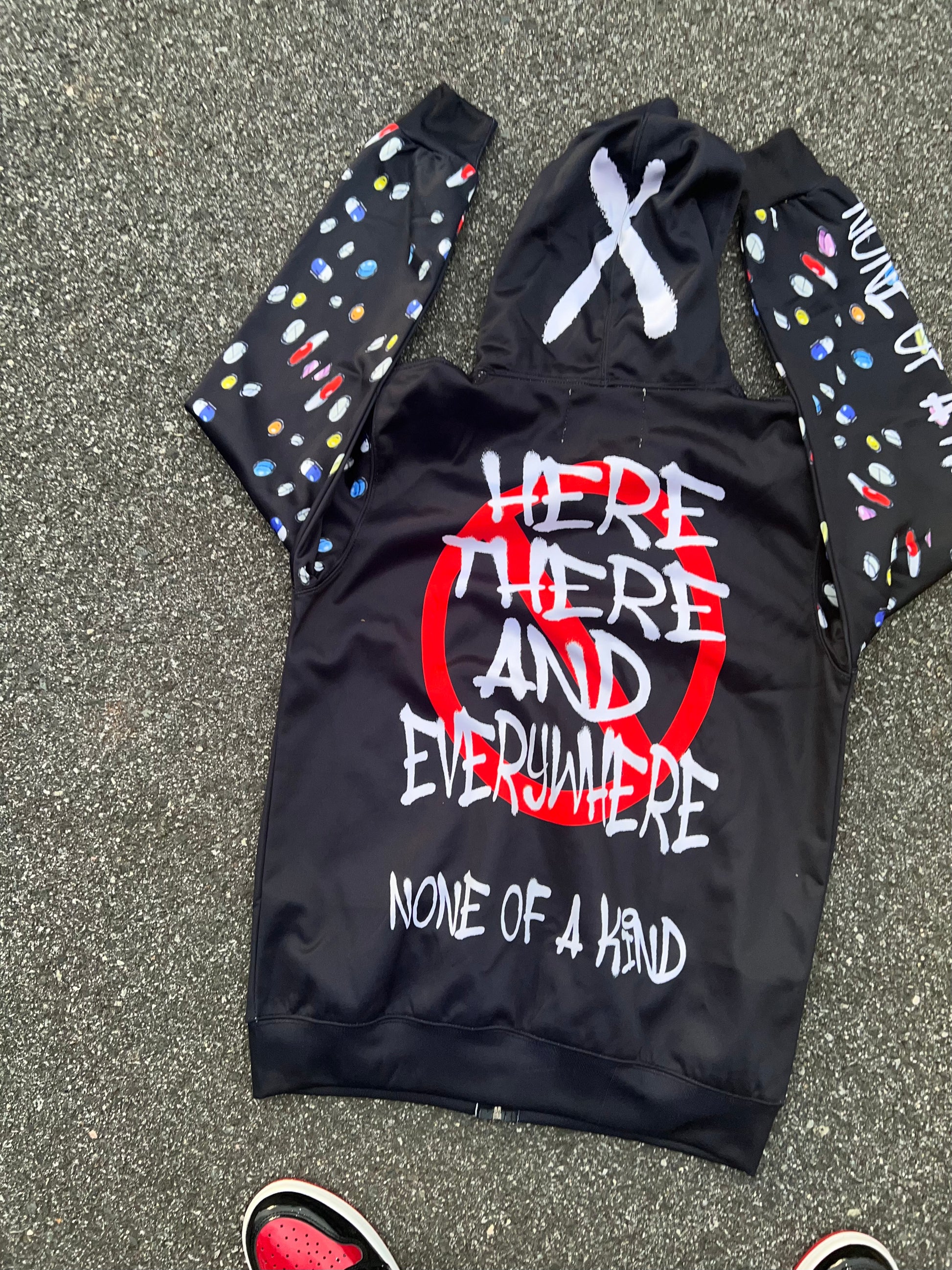 Sublimated  [ falling pills] logo going down each side of the sleeves with [WHITE] None of a kind over it