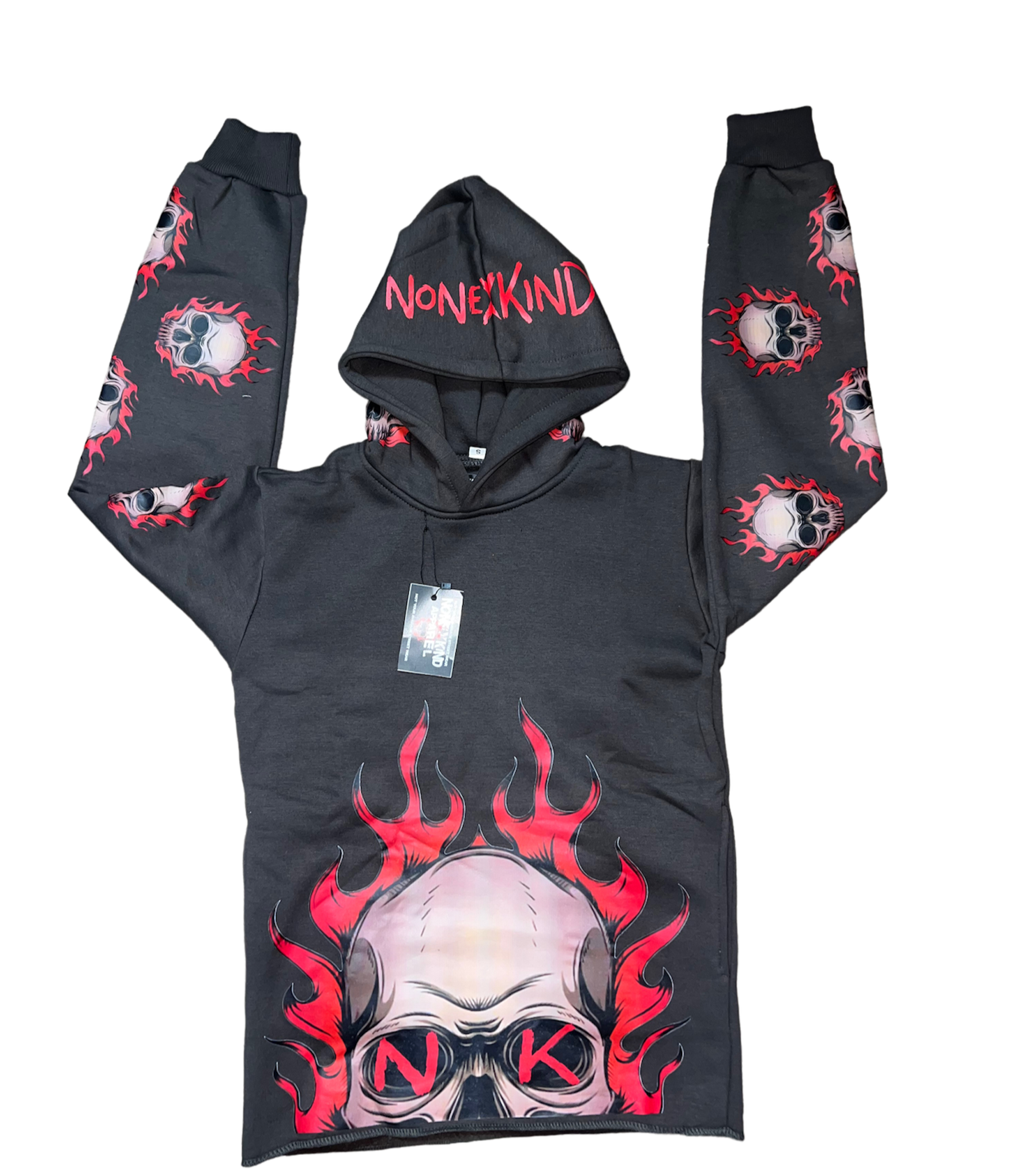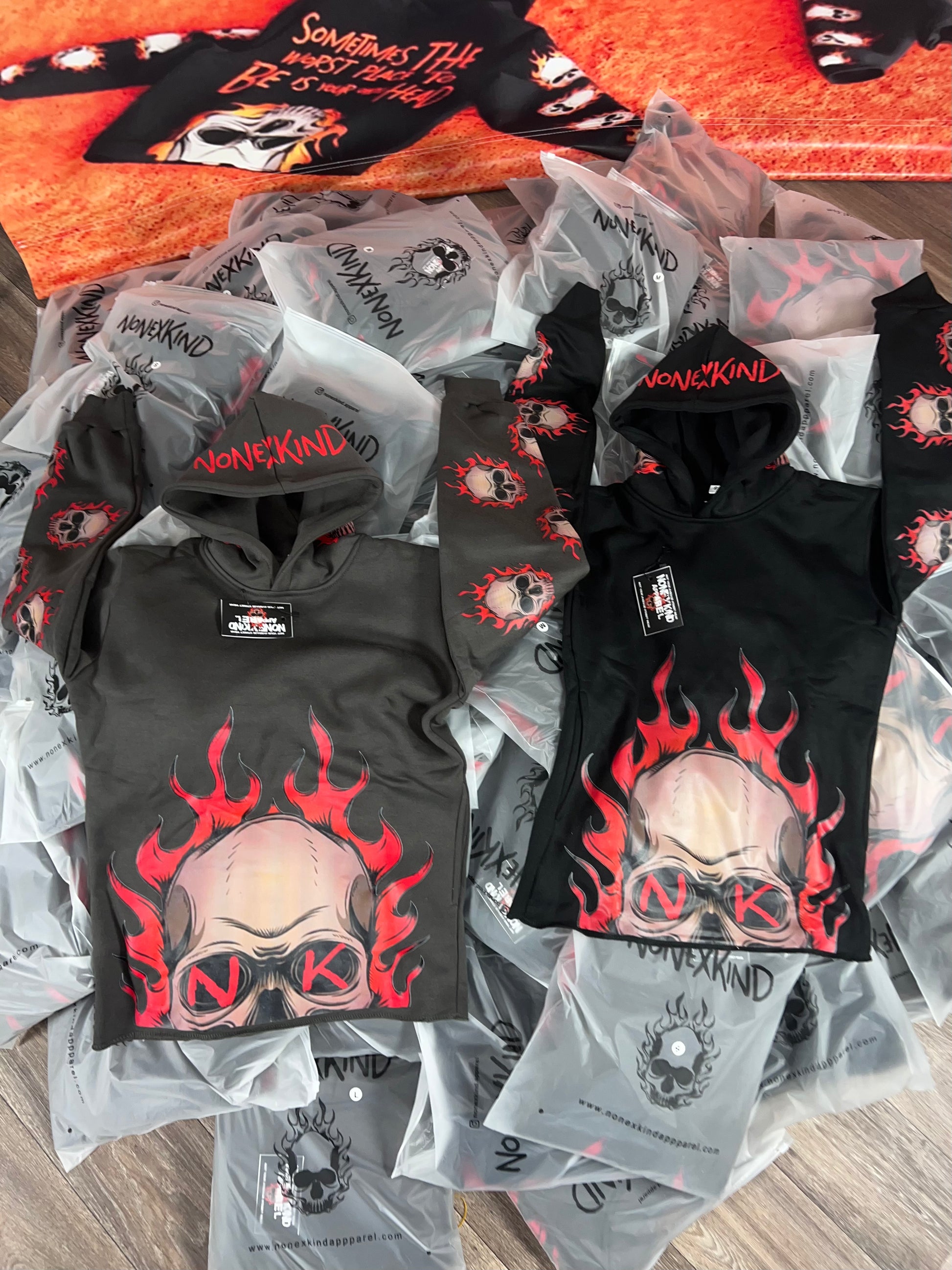 DTG jumbo Printed half “FLAMING SKULL HEAD” going down the whole front of the hoodie